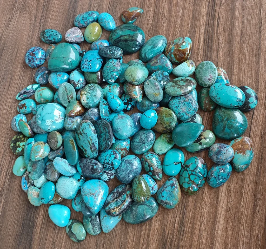 Turkoois varieert van lichtblauw tot blauwgroen, vaak met donkere adertjes van ijzeroxide of koper.